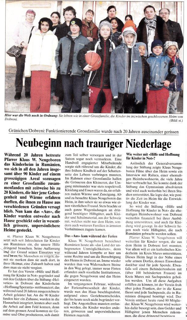 - Unsere Arbeit mit dem Kinderheim hatte Vorbildcharakter. Unternehmen und Einzelpersonen wurden zu Hilfeleistungen animiert. Zwei Schulklassen aus der nahen Stadt Piatra Neamt hatten vor Weihnachten Geschenke für die Kinder in unserem Heim gesammelt. Der Gedanke, dass die notwendigen Gelder für den Betrieb des Kinderheims in der Zukunft vermehrt aus rumänischen Quellen, von Personen, Unternehmen, Einrichtungen und Autoritäten kommen sollen, war eigentlich Ziel und Aufgabe die wir sehr ernst nahmen.
